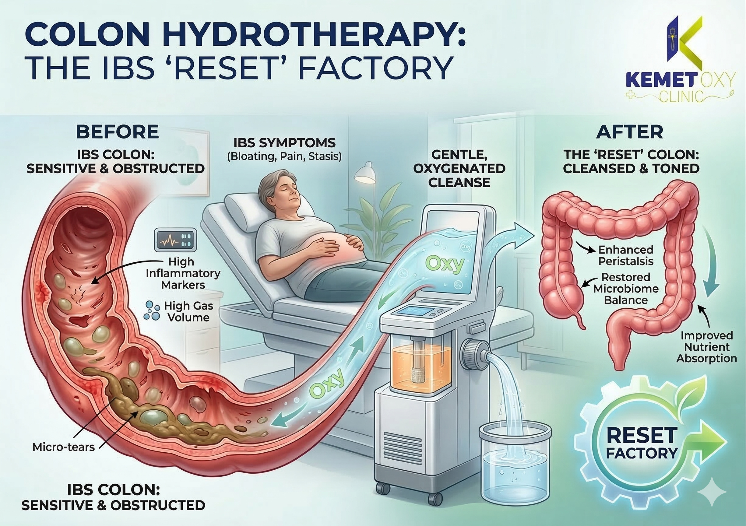Performed by trained professionals with disposable equipment, risks are low—mainly mild cramping or fatigue initially. Not suitable for pregnancy, recent bowel surgery, diverticulitis, or inflammatory bowel disease. Hydrate well before and after, and pair with probiotics for optimal microbiome recovery. Consult a specialist to integrate safely with nutrition or HBOT protocols.